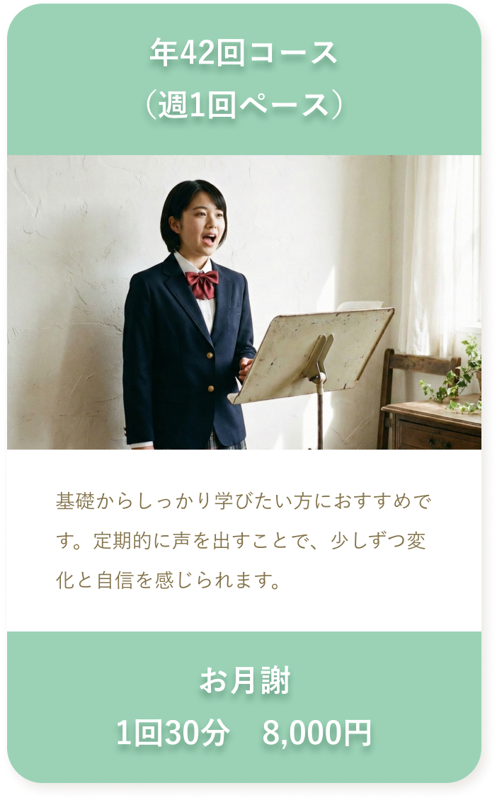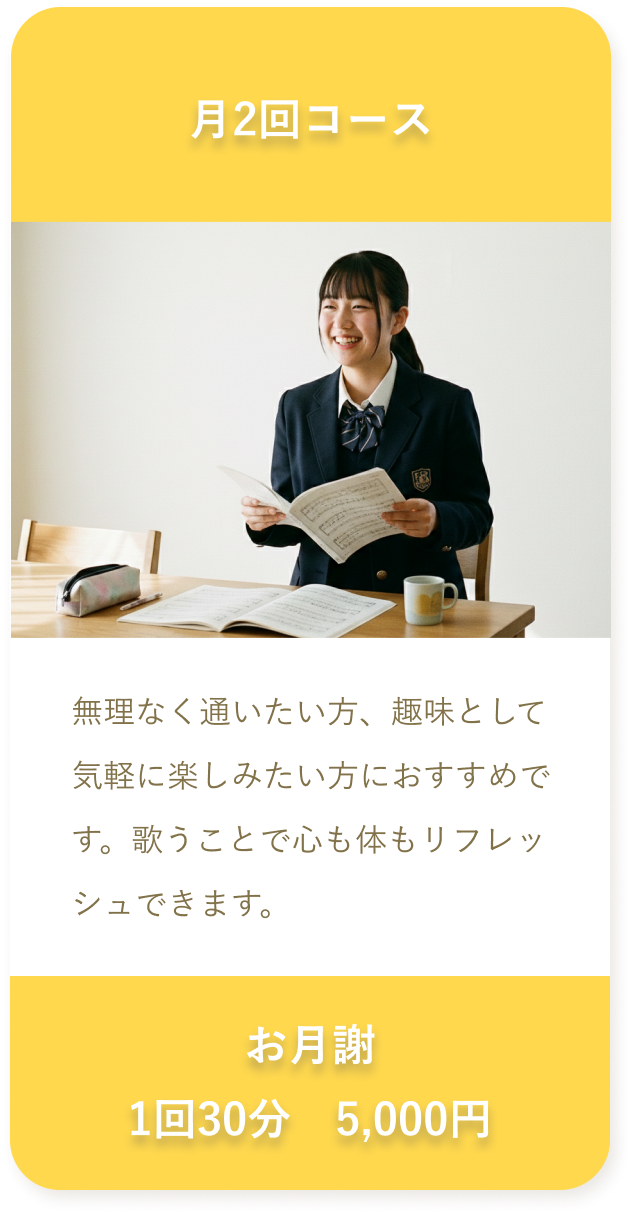 週1回(月3〜4回)・30分の個人レッスンを基本に、月2回や1レッスン制も選べます。